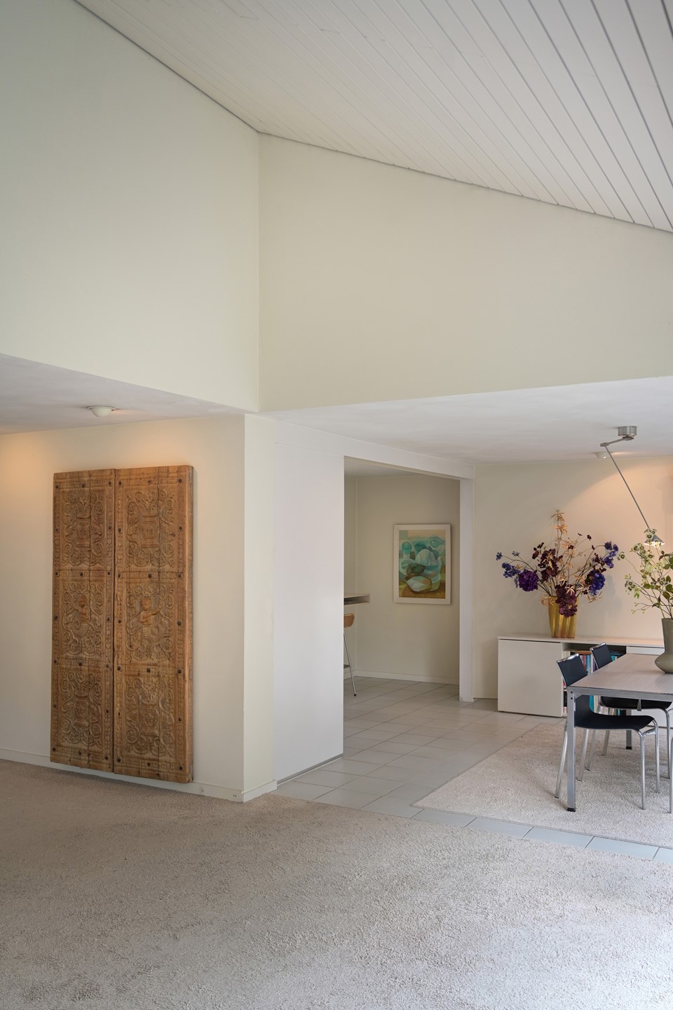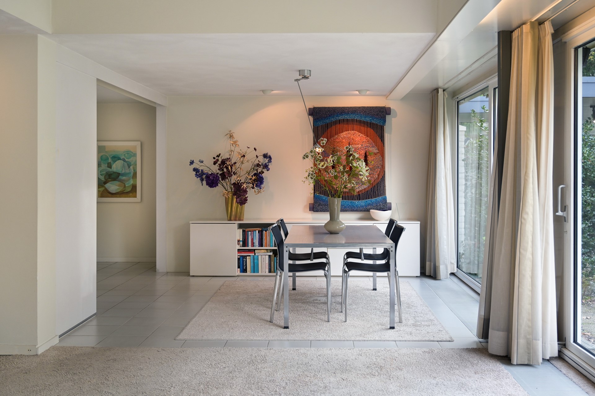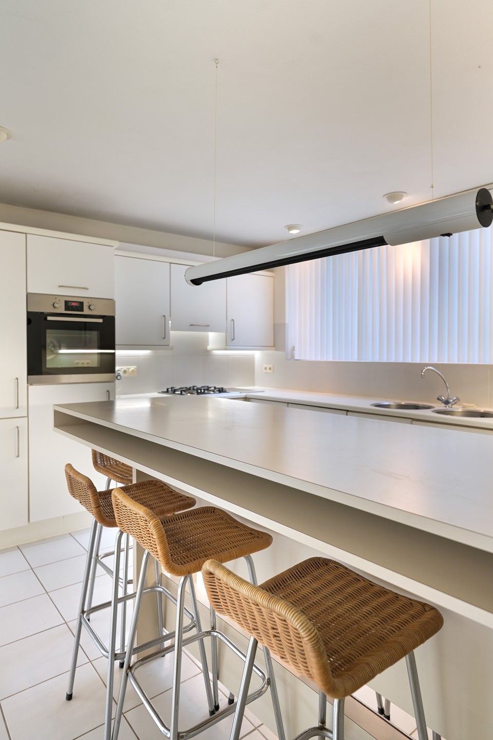 Vanuit de woonkamer is er direct toegang tot keuken, bijkeuken en garage.