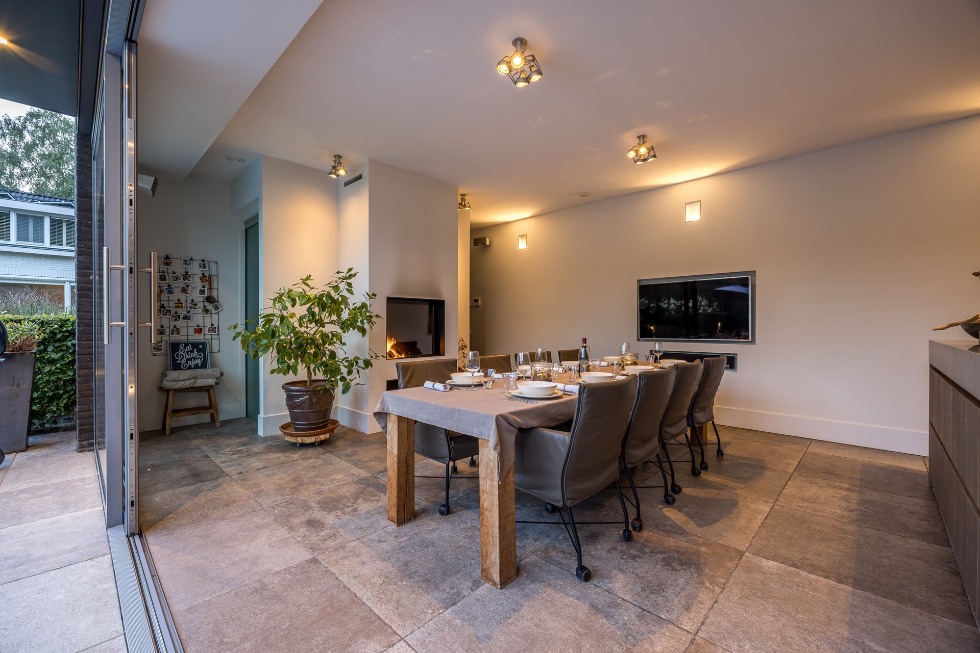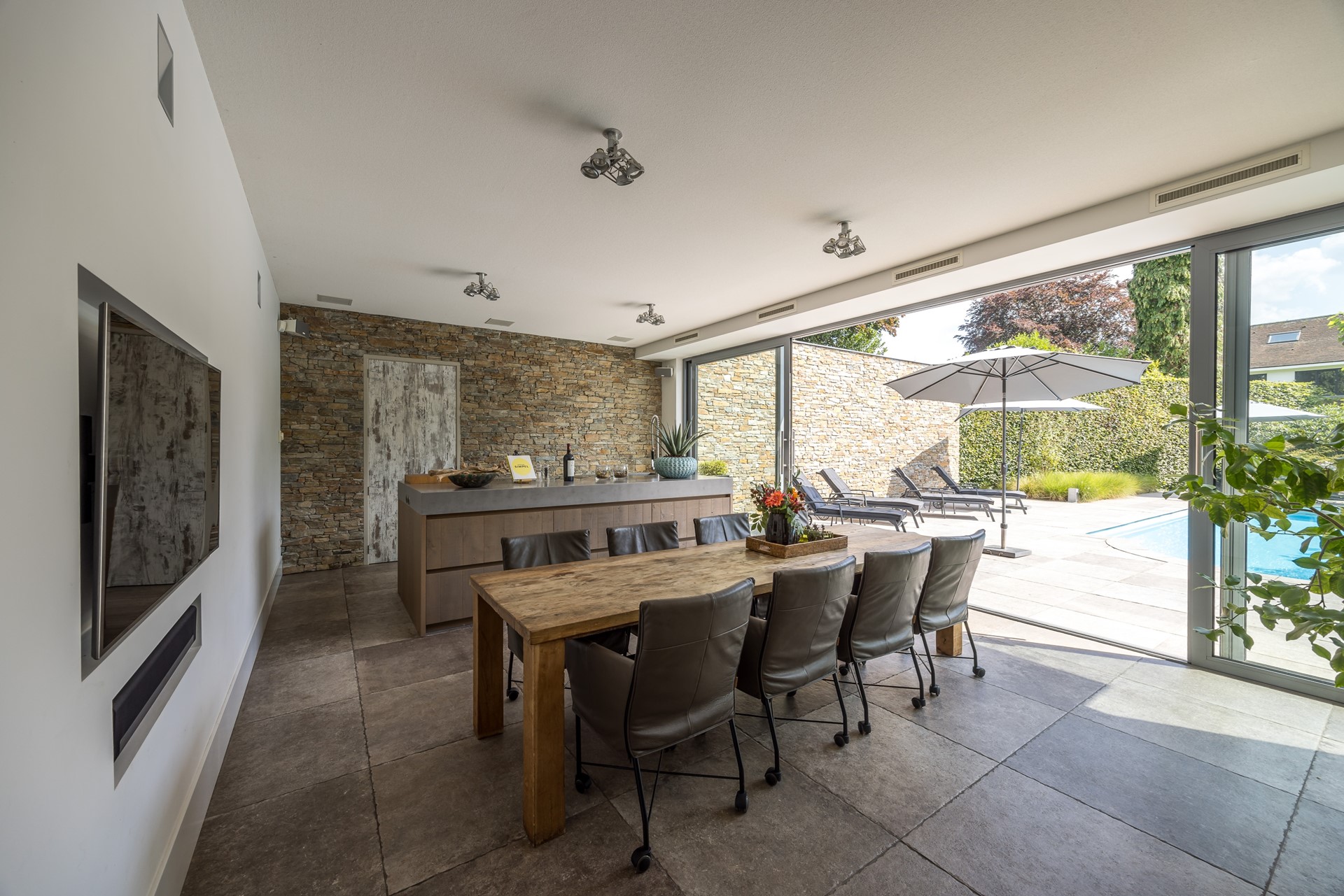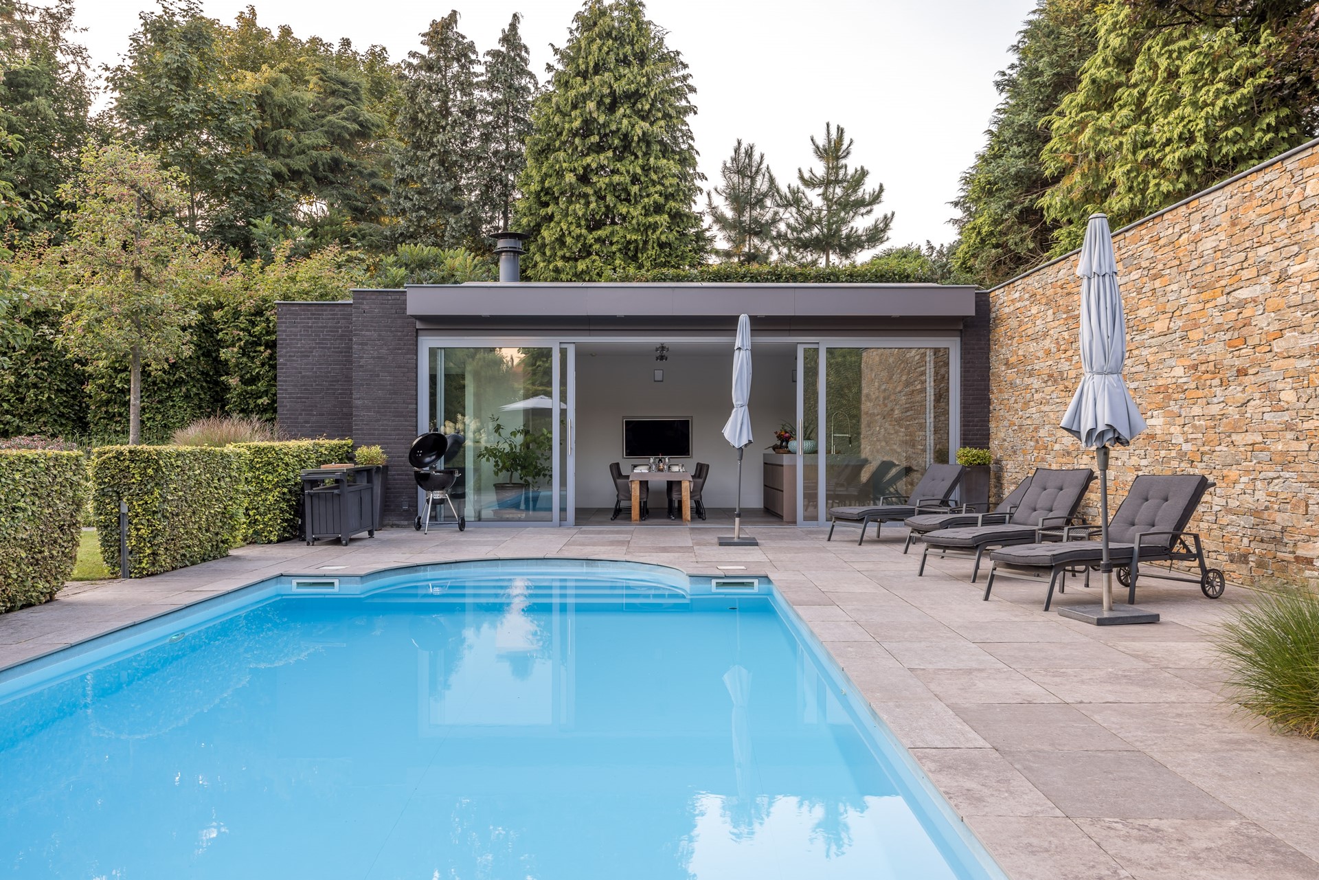 Op zomerse dagen stap je zo vanuit de woonkamer het terras op, richting het poolhouse en je eigen zwembad. Het poolhouse is een veelzijdige ruimte met een volledig uitgeruste keuken, extra bergruimte, douche en toilet. Met deze complete voorzieningen is het een volwaardige tweede leefruimte. Binnen is plaats voor een grote eettafel met comfortabele zitplekken – perfect voor lange diners, een borrel of een ontspannen middag uit de zon.