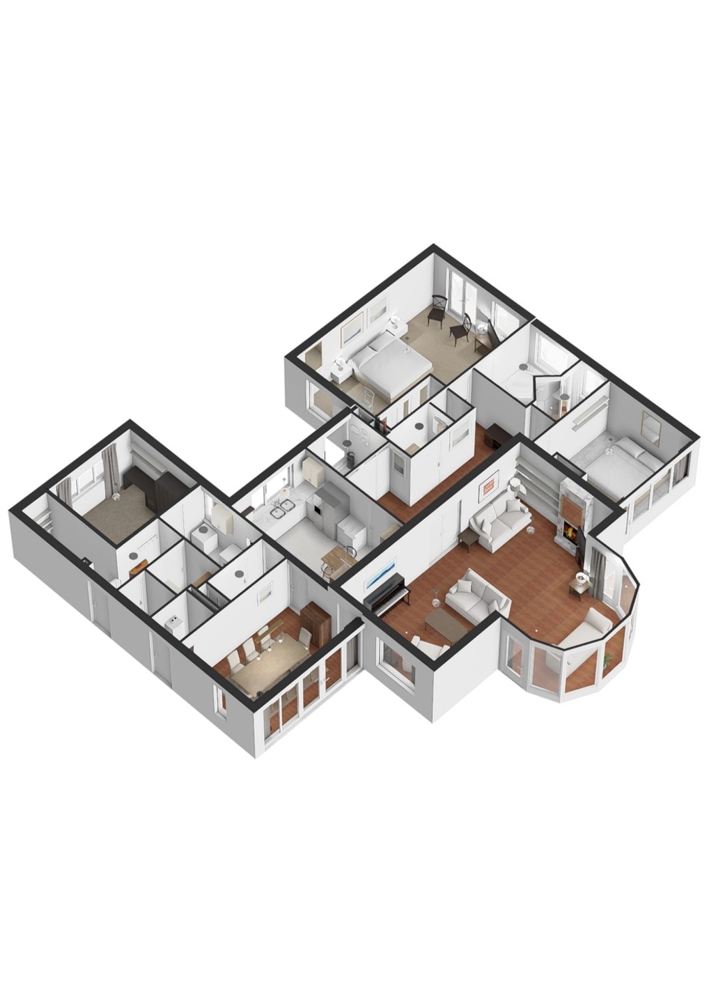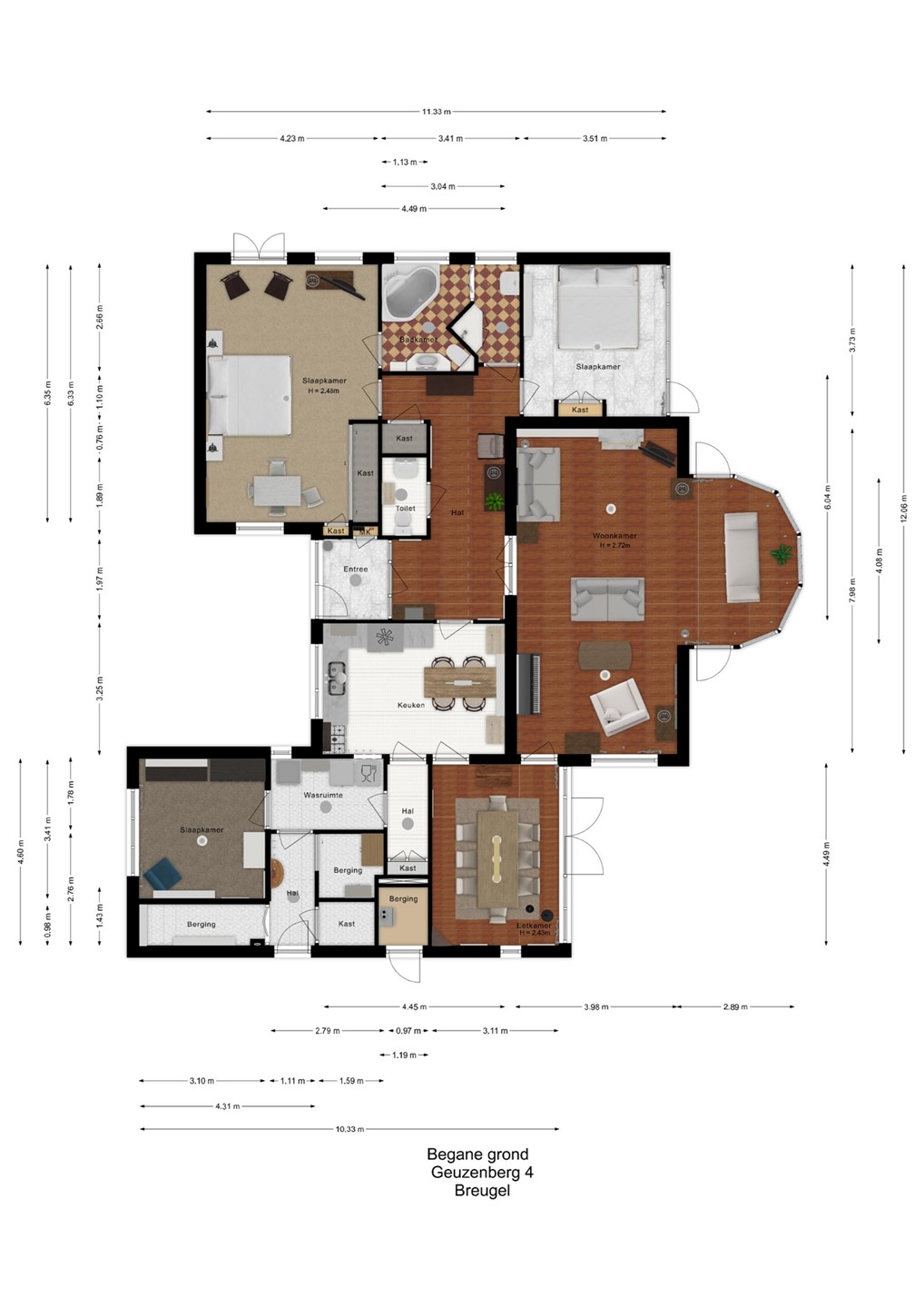 Aan de rechterkant ligt de keuken met berging en werkkamer. Tevens biedt de keuken direct toegang tot de eetkamer.